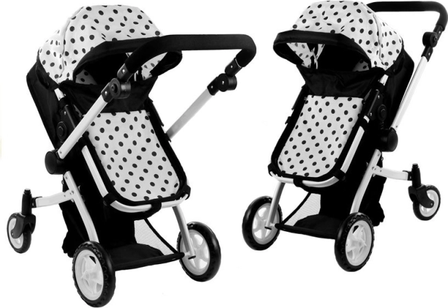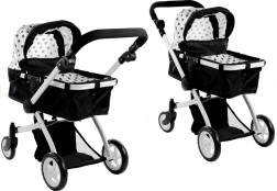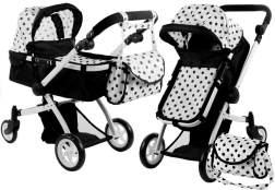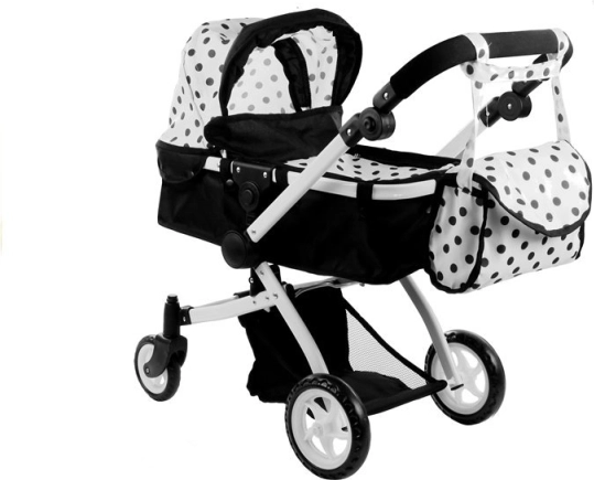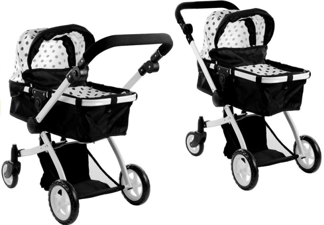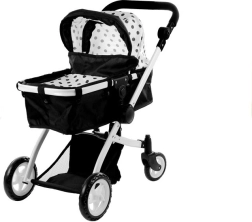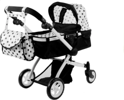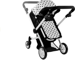 De ALICE poppenwagen in elegant zwart-wit met stippen biedt een universele 2-in-1 oplossing – in een handomdraai schakel je van wieg naar sportzitje. Het lichte maar stevige frame van aluminium buizen, schuim- en rubberwielen voor stille ritten binnenshuis en soepel rijden buiten, en een vergrendeling tegen onbedoeld inklappen zorgen voor veilig en comfortabel speelplezier.