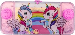 Populair waterhandspel in zakformaat met een schattig eenhoornthema. In het transparante waterreservoir drijven kleurrijke ringetjes; met twee knoppen zet je de waterstroom in beweging en probeer je de ringetjes op de pinnetjes van de doelen te plaatsen. Simpel, boeiend en zonder batterijen.