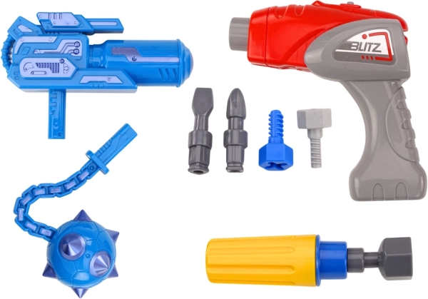 - Rijke accessoires: boor, schroevendraaier, verwisselbare opzetstukken, knots en wapen