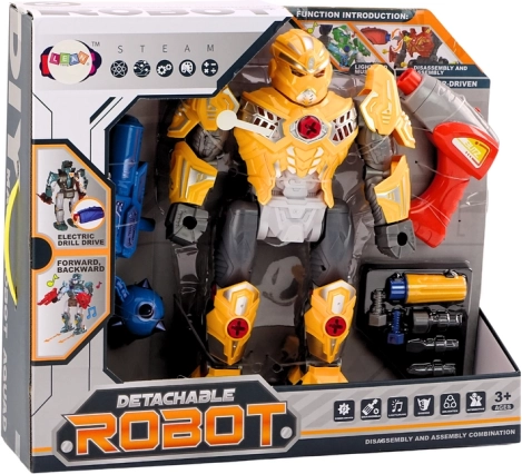 Een leuke en leerzame bouwset van een schroefrobot in helder geel die de fijne motoriek en het logisch denken ontwikkelt. Kinderen kunnen de robot zelf uit elkaar halen en weer in elkaar zetten met de kinderboor en -schroevendraaier, opzetstukjes wisselen en spelen voor kleine ingenieur. Na het monteren kan de robot op batterijen rijden en bewegen, met extra beleving door lichteffecten en geluidseffecten. Er is ook fantasierijke uitrusting (blauw wapen en knots) die creatief spel en spannende missies stimuleert.