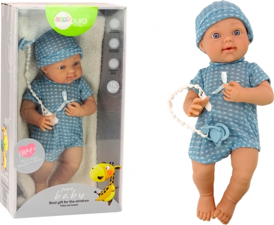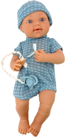 Babypop in blauw outfit met mutsje en speen biedt kinderen de mogelijkheid zich onder te dompelen in de fantasiewereld, terwijl hun fijne motoriek en creativiteit worden ontwikkeld dankzij de beweegbare armpjes en beentjes.