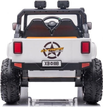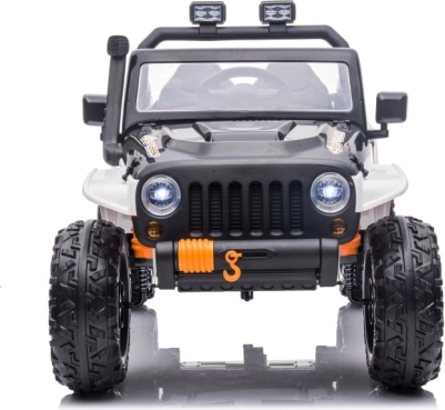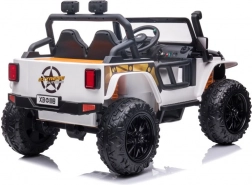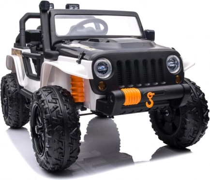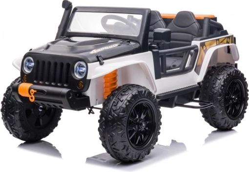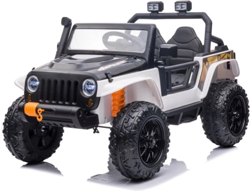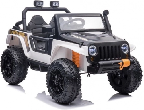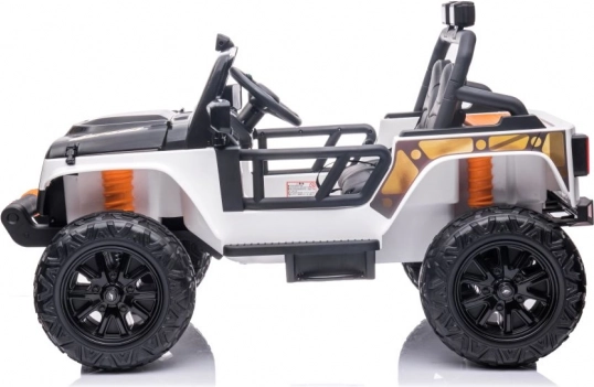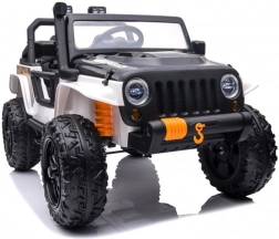 Stijlvolle elektrische kinderauto in het wit met een realistische terreinwagenlook, grote wielen en een duurzame constructie voor buitengebruik. Dankzij de dubbele zitplaats, het stuur en werkende verlichting biedt het een authentieke rijervaring. Ideaal voor tuin en erf, stimuleert actief spel en verbeeldingskracht.