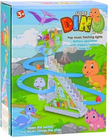 Deze kleurrijke dinosaurusbaan is ontworpen voor intuïtief, boeiend en steeds weer leuk spel. Kinderen plaatsen de figuurtjes op de trappen, starten het mechanisme en kijken hoe de dinosaurussen zelf omhoog klimmen en vlot naar beneden glijden. Licht en geluid vergroten het enthousiasme en stimuleren de zintuiglijke waarneming.