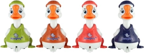 Eenvoudig vliegwielmechanisme: druk op het hoofd van het eendje en het rijdt vooruit zonder batterijen. Leuk spel en ontwikkeling van de motoriek.