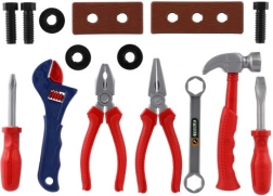 Hamer, schroevendraaier, tang, sleutel, moeren en bouten (samenstelling kan variëren)