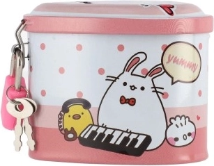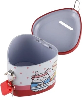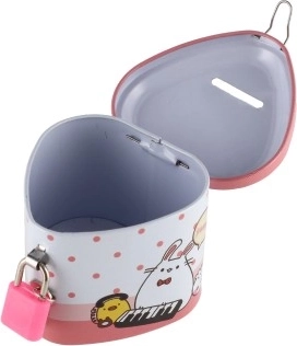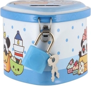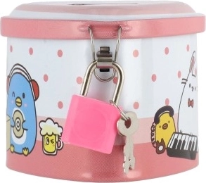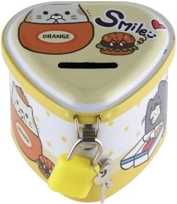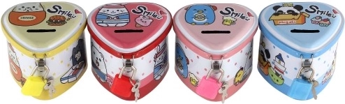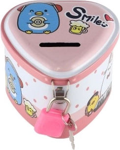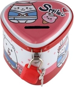 Een schattige blikken spaarpot in hartvorm helpt kinderen bij hun eerste spaargeld en het leren tellen. Hij heeft een praktische sleuf voor muntjes en is met slot met twee sleutels, zodat kleingeld veilig blijft. De compacte afmetingen van 8 × 7 cm en de vrolijke motieven in 4 kleurvarianten zullen elk kind blij maken.