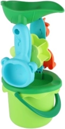 De praktische set combineert een emmer met zeef, schep en harkje – ideale uitrusting voor het bouwen van kastelen en het zeven van zand.