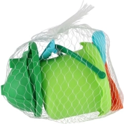 De lichte kunststof set in vrolijke kleuren wordt geleverd in een praktisch net – ideaal voor in de zandbak en aan zee.
