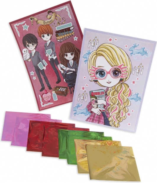 Deze leuke en eenvoudige creatieve set brengt de magie van de HARRY POTTER-wereld binnen handbereik. Op twee thematische afbeeldingen met de personages Harry, Hermelien, Ron en Loena zitten zelfklevende vlakken verborgen die je na het afpellen versiert met de meegeleverde folies. In een paar minuten maak je prachtige, metallic glanzende afbeeldingen, ideaal als decoratie of als origineel cadeau.