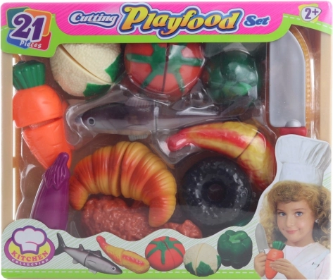 Leuke en veilige snijset voor kinderen met 21 stuks voedsel verbonden met klittenband. Kinderen kunnen het eten steeds weer “snijden”, oefenen zo hun fijne motoriek, coördinatie en leren verschillende soorten groenten en brood herkennen. Ideaal speelgoed voor kinderen vanaf 2 jaar.