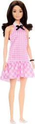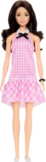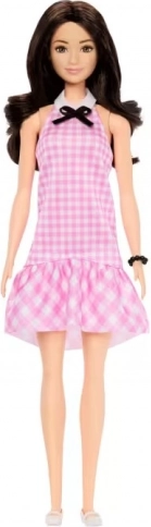 De Barbie Fashionistas-pop brengt een moderne interpretatie van retrostijl, geïnspireerd op de Quick Curl-look uit 1973. De elegante roze jurk met gingham-patroon wordt aangevuld met een zwarte strik bij de hals, witte schoenen en een zwarte armband – samen vormen ze een chique outfit voor dagelijks spel en speciale gelegenheden.