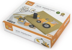 De creatieve kurk-hamerbordset van VIGA met bouwvoertuigen enthousiasmeert kleine bouwers vanaf 3 jaar. Houten vormen met gaatjes worden met punaise-spijkers en een hamertje op het bord bevestigd – kinderen ontwikkelen hun fijne motoriek, logisch denken, creativiteit en concentratie. De set bevat 45 onderdelen, een kurken bord, een hamertje, punaise-spijkers en voorbeeldkaarten van bouwmachines.