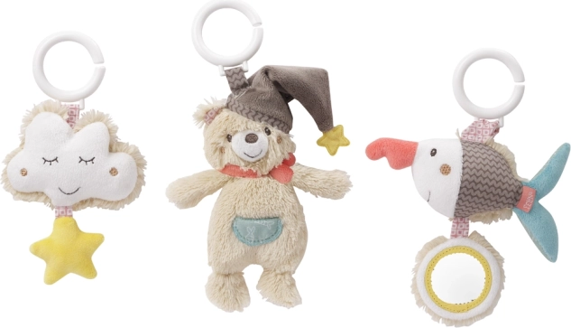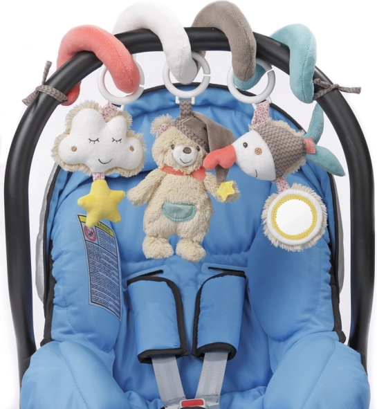 De kleurrijke pluchen spiraal voelt prettig aan en dankzij de hangende speeltjes worden kinderen aangemoedigd om nieuwe prikkels te ontdekken. Het stimuleert hun zintuigen en biedt vermaak. Aan de spiraal hangen drie vrolijke hangers in de vorm van een wolk, een beertje en een visje. De speeltjes aan de spiraal zijn beweeglijk dankzij de ringetjes en kunnen afzonderlijk worden verwisseld.