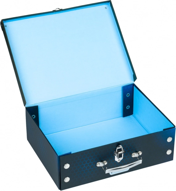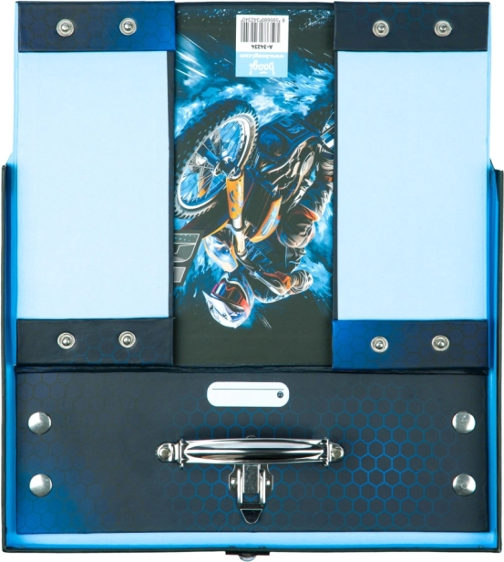 De opvouwbare schoolkoffer met motorcrossmotief is gemaakt van hoogwaardig gelamineerd papier met verstevigde hoeken voor verhoogde duurzaamheid. Het biedt de praktische mogelijkheid om op te vouwen en uit te vouwen dankzij de drukknopen, wat het opslaan en vervoeren vergemakkelijkt. Het metalen handvat en de klassieke gesp zorgen voor gemakkelijke hantering en veilige sluiting van de inhoud.