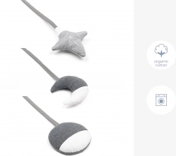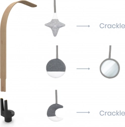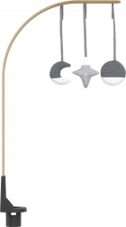 Drie speeltjes die aan de boog hangen, stimuleren de zintuigen van de baby dankzij kleurcontrasten en knisperende geluiden.