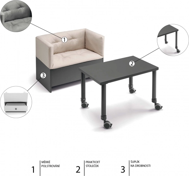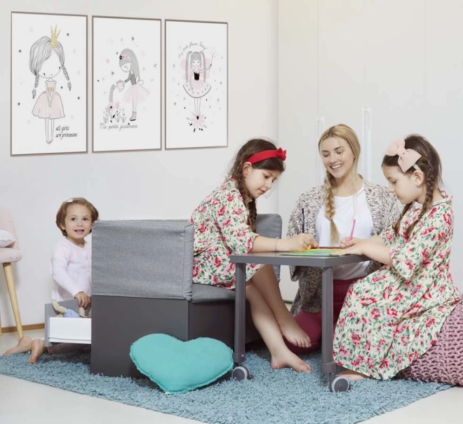 Als de verschoonperiode voorbij is, bouw je de commode eenvoudig om tot een knusse bank met zachte bekleding en een praktisch tafeltje om te spelen en te knutselen.
