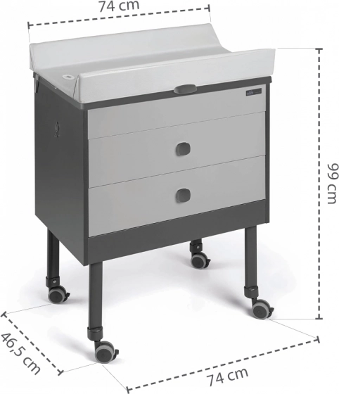 De stabiele constructie met 4 rubberen wieltjes met rem en een kantelbeveiligingssysteem zorgt voor veiligheid bij dagelijks gebruik. Twee grote lades bieden plaats aan luiers, verzorgingsproducten en andere accessoires. Dankzij het minimalistische design en de compacte afmetingen past de commode ook perfect in kleinere interieurs.