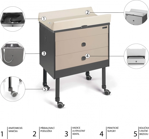 De stijlvolle 2-in-1 verschooncommode GROWI combineert een verschoonblad met geïntegreerd badje voor baby’s tot 11 kg en verandert later eenvoudig in een kinderbank met tafeltje tot ca. 14 jaar. Biedt compacte afmetingen, veilige rubberen wieltjes met rem, een kantelbeveiligingssysteem en twee ruime lades voor overzichtelijke opslag van alle benodigdheden.
