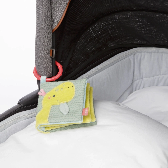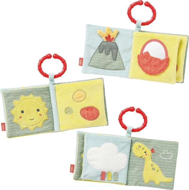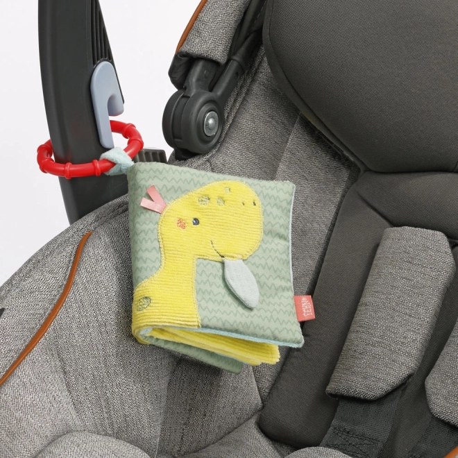 Met het zachte pluchen stoffen boekje kunnen kinderen op 8 pagina’s schattige prehistorische wezens tot leven brengen. Elke pagina heeft verschillende leuke effecten zoals een piepertje, knisperend papier, pluchen eitjes en een spiegeltje. Het boekje stimuleert de grijpreflex, tastzin, fantasie en fijne motoriek. Een praktische bevestigingsring maakt het eenvoudig vast te maken aan het ledikant, de kinderwagen of het autostoeltje.