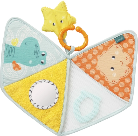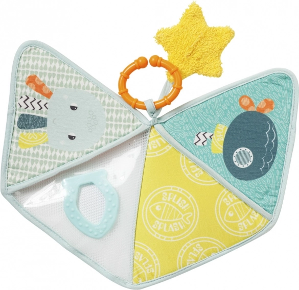 Ontdek de betoverende waterwereld. Tijdens het bladeren door het stoffen boekje maakt je baby kennis met veel nieuwe badvriendjes zoals een onderzeeër, een kleine octopus, een krokodil, schelpen en een zeester. Het verborgen rammelaartje, knisperend papier en de bijtring prikkelen spelenderwijs de zintuigen, verbeelding en fijne motoriek van je kind.