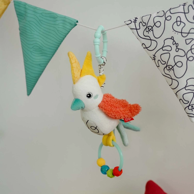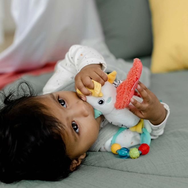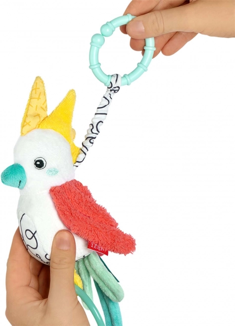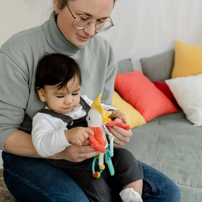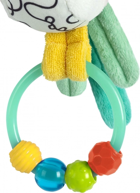 Pluchen rammelaar met veel activiteiten-elementen zoals een grijpring, rammelaar, piepmechanisme en knisperend papier. De grijpspeelgoed stimuleert spelenderwijs het gehoor van het kind, het gezichtsvermogen, de tast, een gezonde greep en logisch denken – ideaal als cadeau voor jongens en meisjes bij geboorte, verjaardag of doop.