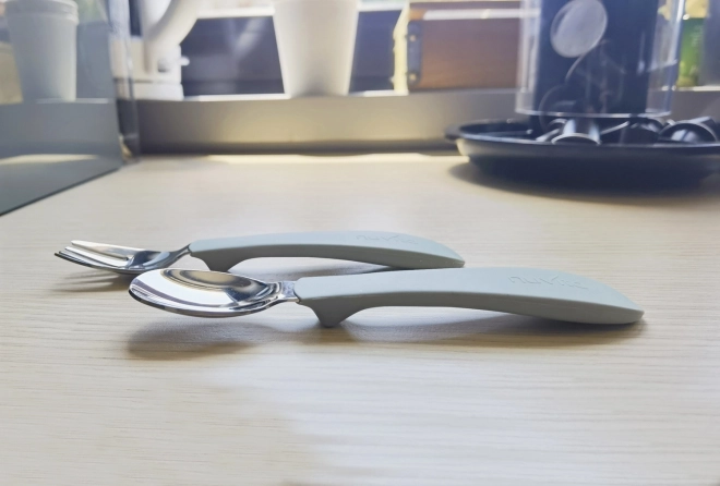 De lepel en de vork hebben een hygiënische “contactloze” steun, die direct contact met oppervlakken voorkomt. Het handvat van het bestek is ergonomisch, zodat het ook voor kinderen die nog leren zelfstandig te eten gemakkelijk vast te houden is. Dankzij het siliconen handvat glijdt de lepel niet uit kinderhandjes.