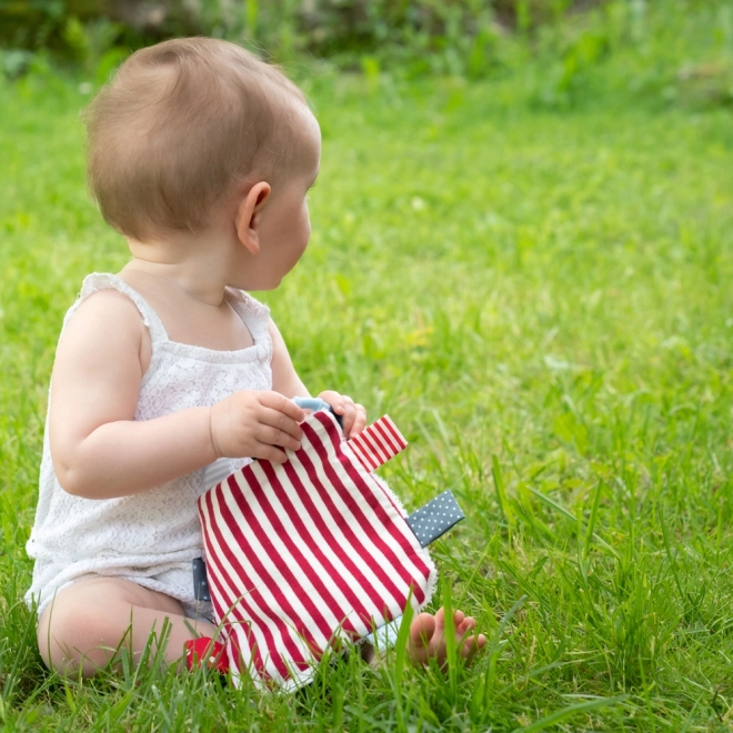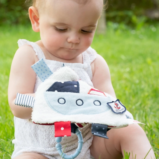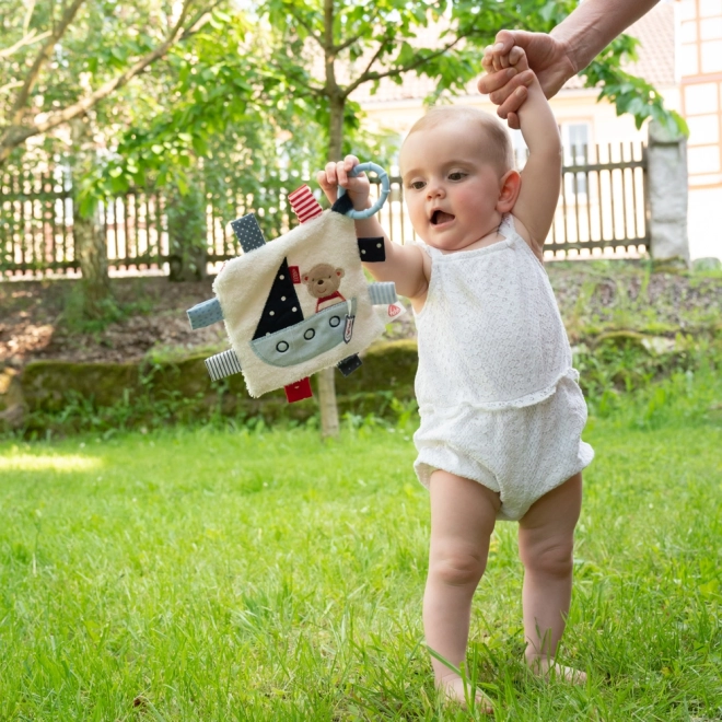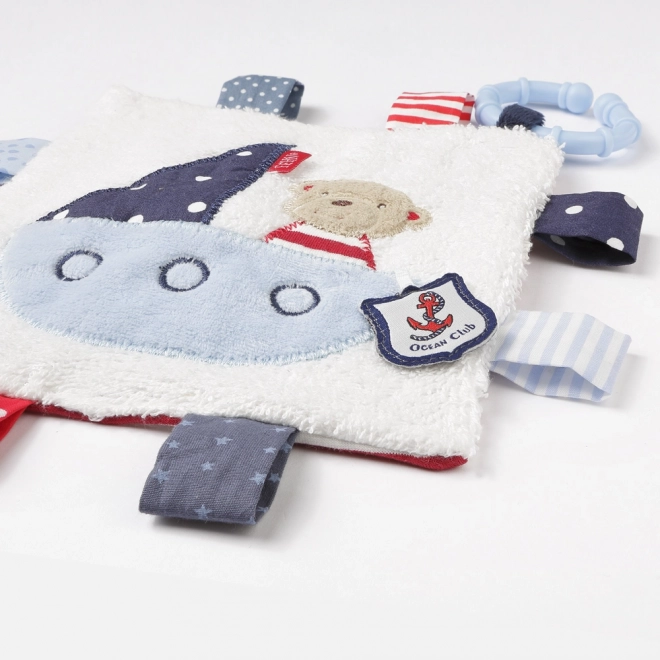 Het knuffeldoekje kan eenvoudig aan een kinderwagen, autostoeltje of wieg worden bevestigd, waardoor het ideaal is voor thuis en onderweg. Het maritieme ontwerp met een schattig beertje in een bootje garandeert dat het altijd een goed humeur bij je kind brengt.