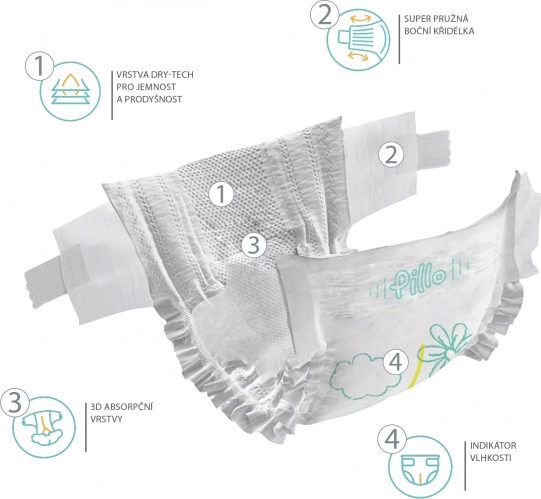 Zachte en betrouwbare luiers voor de gevoelige babyhuid. Hypoallergene samenstelling zonder parfum, crème en latex beschermt tegen irritatie, terwijl de Dryway™-technologie met 3 afvoerkanaaltjes vocht snel afvoert. Tot 12 uur droog, ultrazachte en ademende materialen en superelastische zijkleppen voor een perfecte pasvorm, dag en nacht.