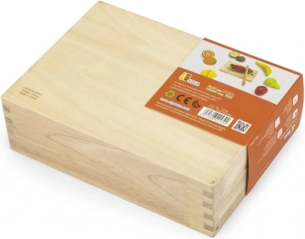 Het praktische houten doosje met transparant deksel dient als opbergbox en als presentatievitrine, zodat alle onderdelen altijd bij elkaar blijven. De set is perfect voor zelfstandig spelen of samen koken met ouders.