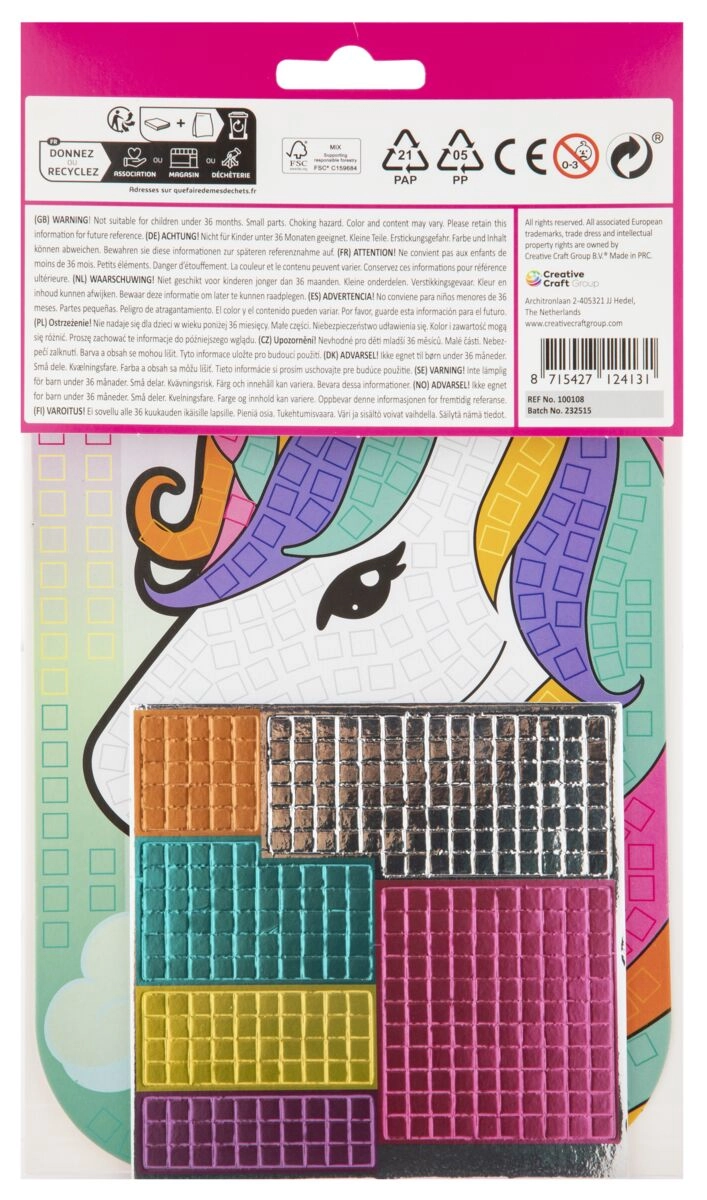 Maak je eigen kleurrijke mozaïeken met de creatieve set Mosaic Art in A5-formaat. Kinderen plakken gekleurde stickers op de voorbedrukte sjablonen en toveren in een mum van tijd een pakkend mozaïekplaatje tevoorschijn. Kies uit de motieven vlinder, dinosaurus, eenhoorn en aquarium. Geweldig voor de ontwikkeling van de fijne motoriek, creativiteit en geduld. Geschikt vanaf 3 jaar.