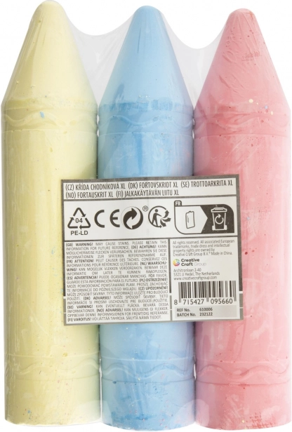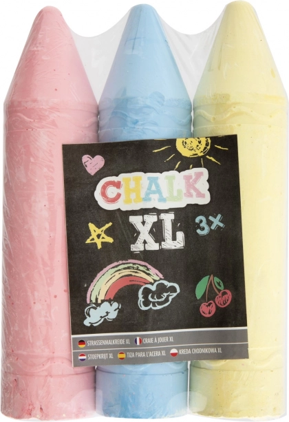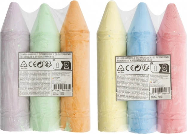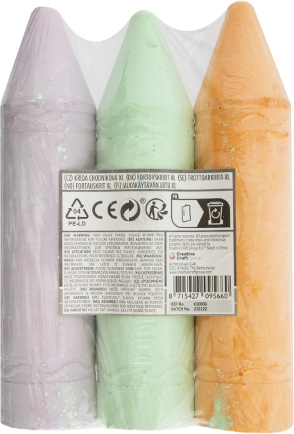 Verhoog je tekenactiviteiten met deze XL kleurkrijtjes, beschikbaar in twee varianten - geel, blauw en roze of oranje, groen en paars. Elke set bevat drie krijtjes met een optimale lengte van 19 cm, wat het vasthouden tijdens het tekenen vergemakkelijkt.