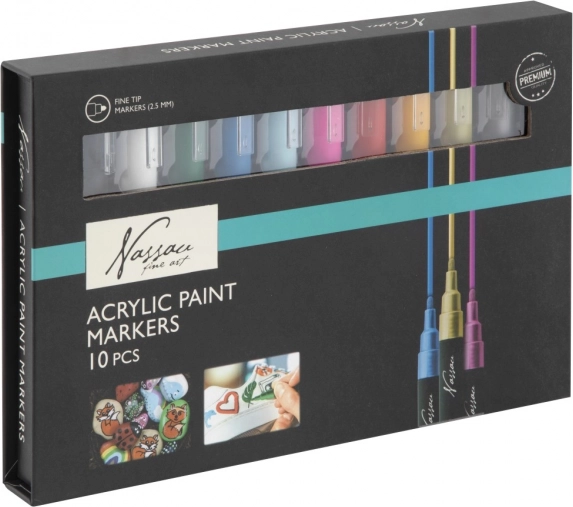 Ontdek de magie van creativiteit met acrylmarkers van het merk Nassau Fine Art. Deze set bevat tien markers in verschillende kleuren, ideaal voor gebruik op canvas, keramiek, hout, glas en plastic. Dankzij hun universele inzetbaarheid kan de kunstenaar vrij experimenteren met uiteenlopende technieken en stijlen.