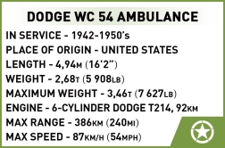 Deze realistische bouwset van de Dodge WC 54 laat je een stukje geschiedenis nabouwen met authentieke details. Het model is op schaal 1:35 en biedt dankzij de licentie van RAM TRUCKS hoge kwaliteit en nauwkeurigheid. Met 293 stenen en een figuur is het ideaal voor zowel bouwers als liefhebbers van militaire geschiedenis.