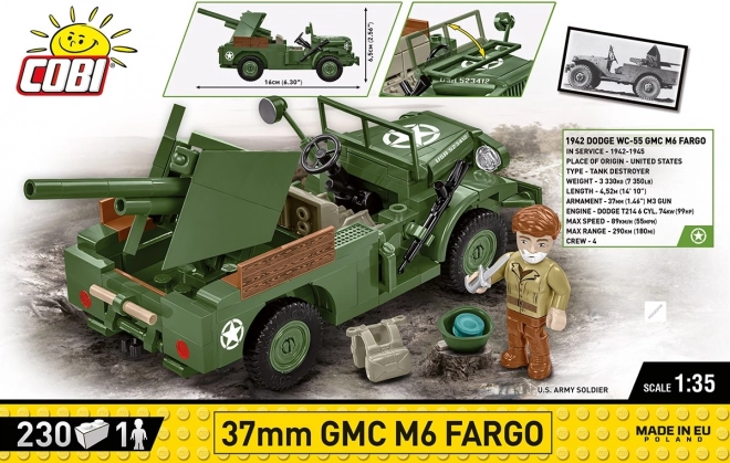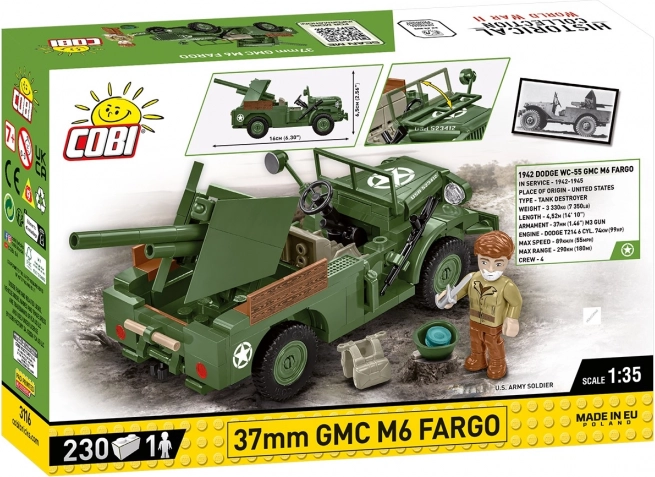 De 37 mm GMC M6 Fargo is een Amerikaans licht gepantserd voertuig dat tijdens de Tweede Wereldoorlog werd gebruikt. Ontwikkeld op het chassis van de Dodge WC-vrachtwagen, was het uitgerust met een 37 mm M3-antitankkanon, wat het effectief maakte tegen lichte pantservoertuigen en versterkingen. Dit blokkenmodel van het merk COBI is uitgevoerd op een schaal van 1:35 en bestaat uit 230 onderdelen.