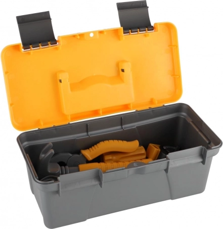Deze rijk uitgeruste kinder gereedschapset biedt kleine knutselaars alles wat ze nodig hebben voor fantasierijk spel – een hamertje, tang, schroevendraaiers, verstelbare sleutel, schroeven, moeren, ringen en “houten” plankjes om te verbinden. Alles is opgeborgen in een stevige koffer die gemakkelijk te dragen is en helpt om orde te houden.