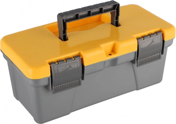 De duurzame plastic koffer met handvat en sluitingen houdt alle onderdelen bij elkaar en is gemakkelijk mee te nemen.