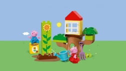 De creatieve set bevat twintig onderdelen, waaronder de figuren Peppa en George. Kinderen kunnen tijd doorbrengen in de tuin of verstoppertje spelen. De boomhut biedt bovendien ruimte om uit te rusten of te spelen via het scharnierende raam, waardoor kinderen hun coördinatie en fijne motoriek ontwikkelen.