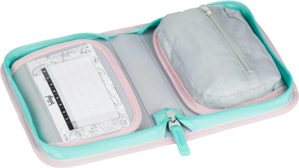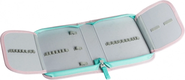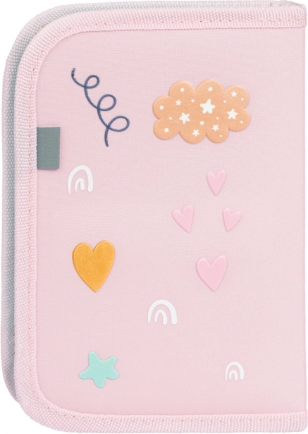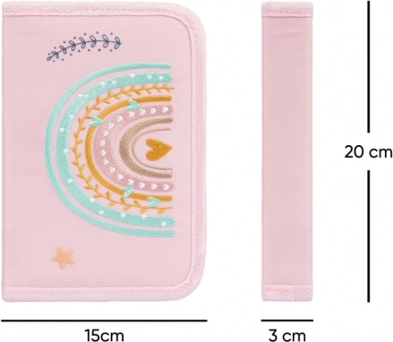Praktische en moderne etui in roze pasteltinten met regenboogmotief, ideaal voor scholieren en studenten. Het eenlaagse ontwerp met twee kleppen zorgt voor overzichtelijke organisatie en snelle toegang tot alle benodigdheden. Duurzame materialen en de YKK-rits garanderen een lange levensduur bij dagelijks gebruik.
