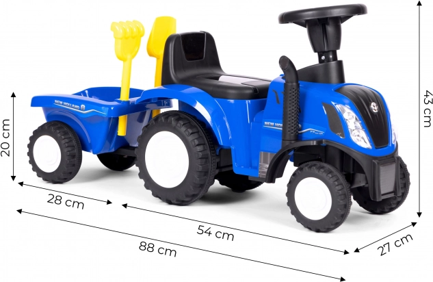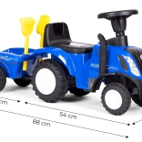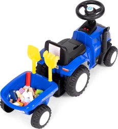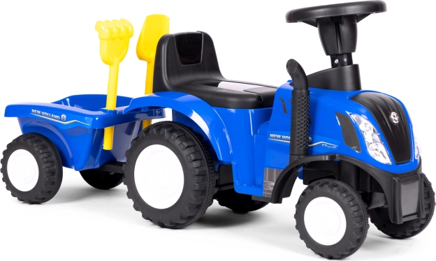 De blauwe looptractor met realistische look en officiële NEW HOLLAND-licentie biedt kinderen uren actieve speelpret, binnen en buiten. De robuuste kunststofconstructie met metalen elementen zorgt voor een lange levensduur en stabiel rijden, terwijl de aanhanger de speelmogelijkheden uitbreidt voor het vervoeren van schatten uit de tuin of zandbak.