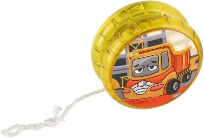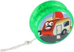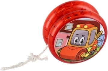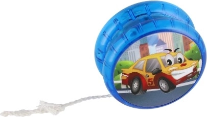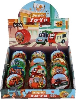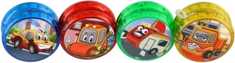 Het jojo is verkrijgbaar in meerdere kleurvarianten, waaronder blauw, rood, groen en geel, allemaal met vrolijke afbeeldingen van vervoersmiddelen.