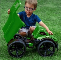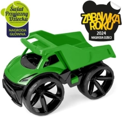 De MAXIMUS-kiepwagen in het groen valt op door de futuristische look, grote matte wielen en zorgvuldig afgewerkte details. De lichte maar stevige constructie is gemakkelijk te bedienen, zelfs door kleinere kinderen, en dankzij het duurzame plastic is hij geschikt voor spel in de tuin, het park en de kinderkamer.