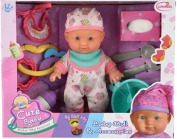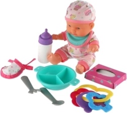 Deze poppenbaby van 22 cm is een geweldige speelkameraad voor dagelijks spel. Dankzij het stevige kunststof lijfje behoudt de pop goed zijn vorm en is hij gemakkelijk schoon te houden. De set bevat alles wat nodig is voor de babyverzorging – van voeden tot vermaken.