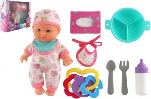 In de verpakking zitten een flesje, een rammelaar, vochtige doekjes en een peuterservies, die realistisch spel stimuleren en motorische vaardigheden en sociale rollen ontwikkelen.