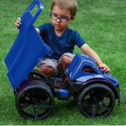 De kiepwagen MAXIMUS valt op door zijn futuristisch design, opvallende blauwe kleur en gedetailleerde afwerking. De brede bumper, schuin geplaatste verlichting en contrasterende oppervlakken geven het speelgoed een moderne uitstraling die de verbeelding van kinderen prikkelt.