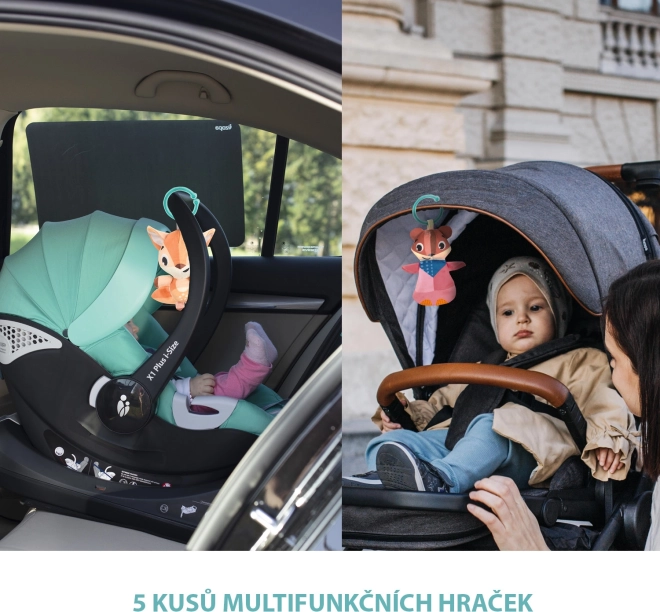 De speeltjes zijn eenvoudig los te maken en te bevestigen aan de kinderwagen of autostoeltje, zodat er ook onderweg speels kan worden ontdekt.