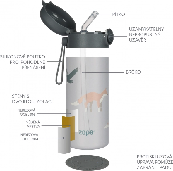 Thermosfles voor dranken met rietje en siliconenhouder 350 ml, Dino