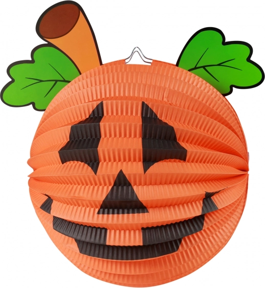 Deze lampion heeft de vorm van een lachende Halloween pompoen met zwarte details en groene bladeren, wat een authentieke feestelijke sfeer toevoegt.