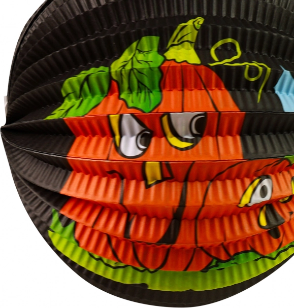 Creëer op je feestje de perfecte Halloweensfeer met deze ronde papieren lantaarn. Hij heeft een zwart design met pompoenmotieven, een praktische houder voor een kaars aan de onderzijde en een diameter van 25 cm – de ideale decoratie voor elke Halloweenparty.