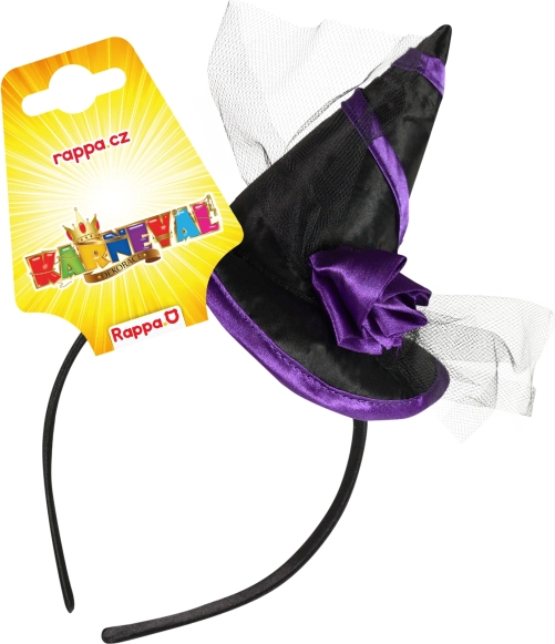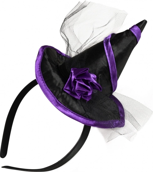 Stijlvolle heksenhaarband, perfect als accessoire voor feestjes, carnaval en Halloween. Combineert een zwart‑paarse uitvoering, een satijnen minihoedje en een tule bloemenversiering voor een opvallende en fotogenieke look.