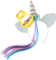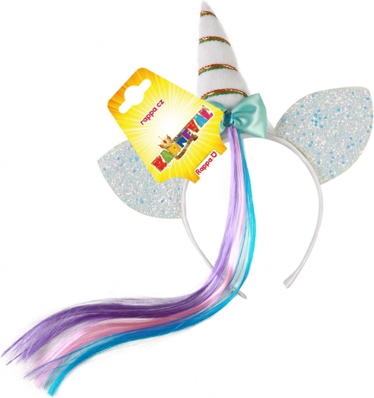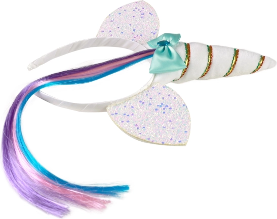 Laat de fantasie van kinderen stralen met deze magische eenhoorn-haarband. Witte haarband met hoorn, zilveren oortjes, decoratieve strik en een regenbooglok – ideaal voor carnaval, verjaardagsfeestjes en dagelijks verkleden. Geschikt voor kinderen vanaf 3 jaar.